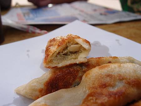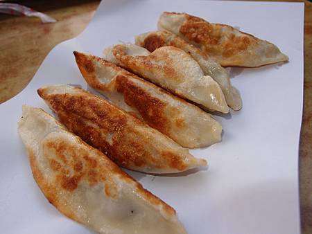 鍋貼(6個)-NT 20, 每個鍋貼約略七公分左右,價錢十分親民,鍋貼一樣不是冷凍鍋貼,都是店家早上剛包好直